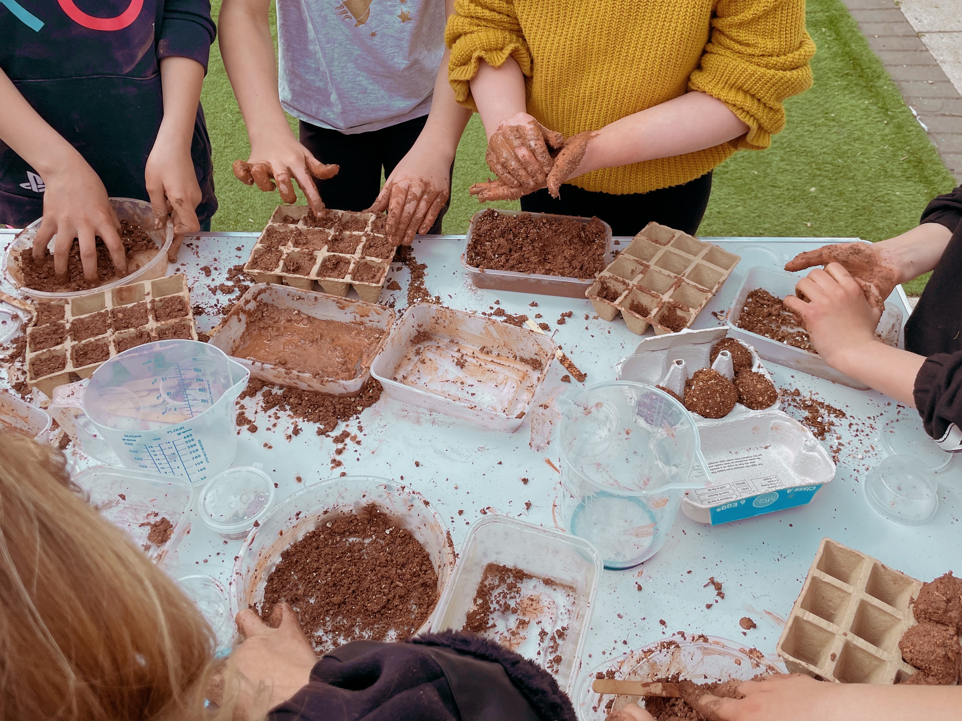 “Outside in our garden today making seed bombs using wild flower seeds, clay and soil… the kids absolutely loved it” – school